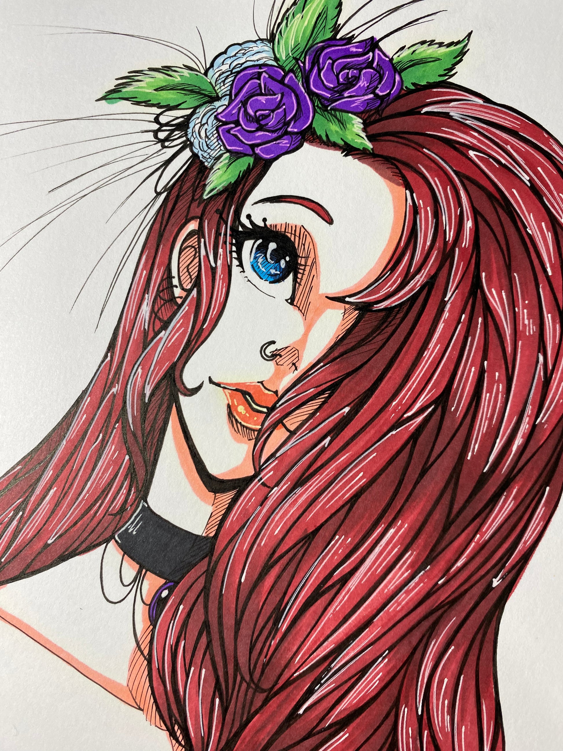 Piece was drawn in 2017 on 9”x12” bristol with micron ink pens, white gel pen and alcohol markers.