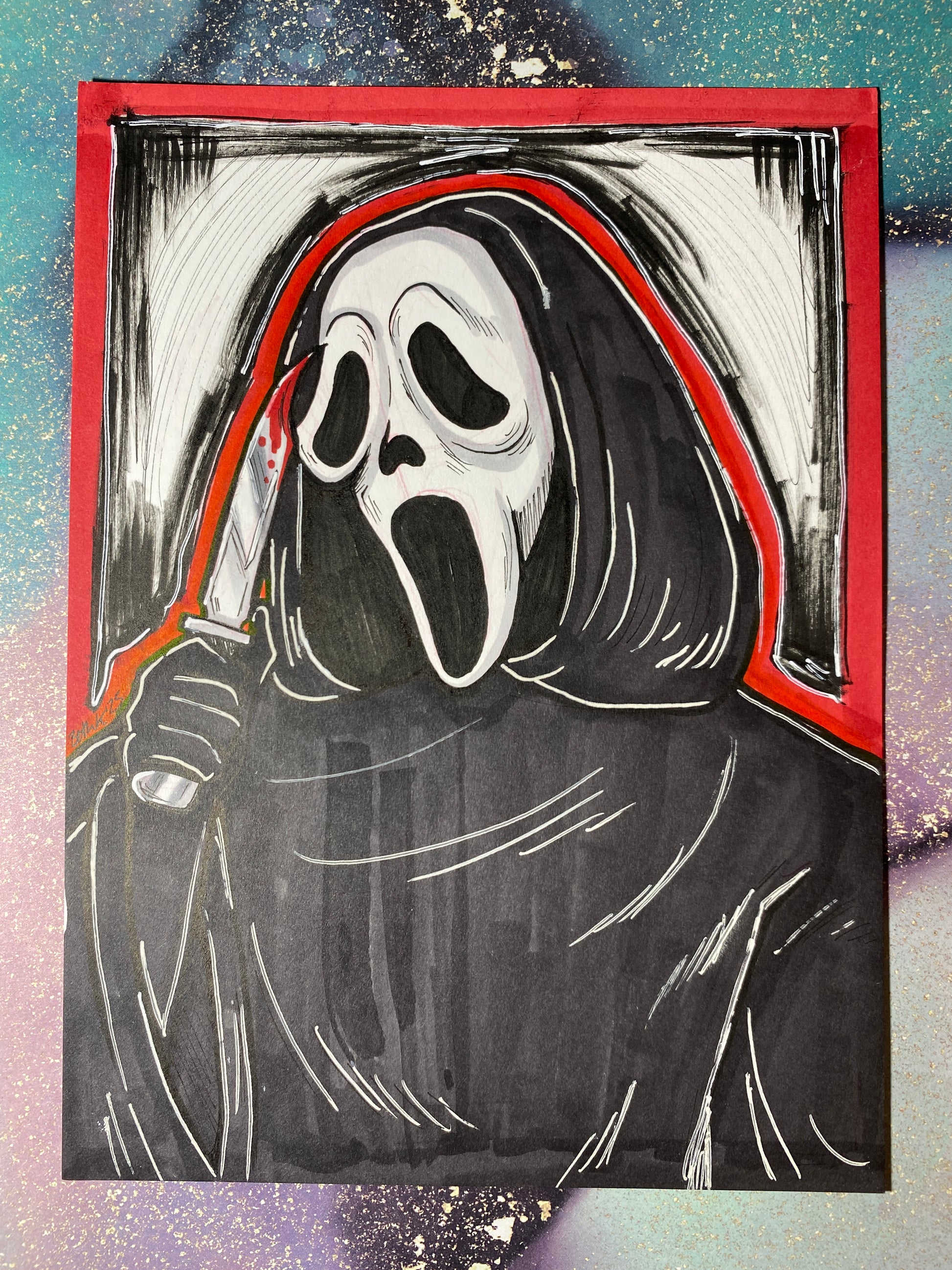 Artwork measures 5”x7”, drawn on card stock with ink, alcohol marker and white gel pen.