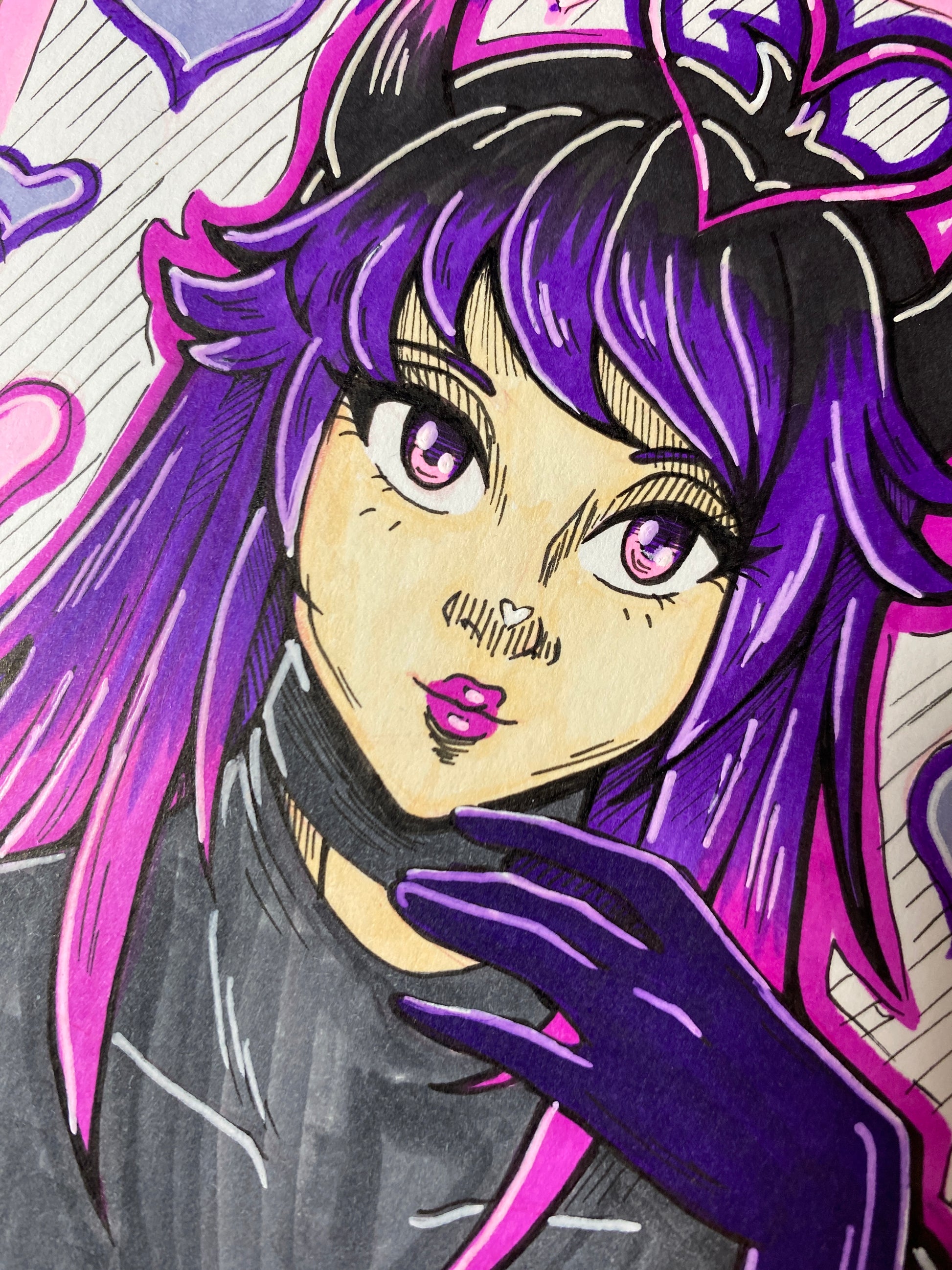 Art measures 4”x6”, drawn on card stock with ink pen, alcohol marker and white gel pen.
