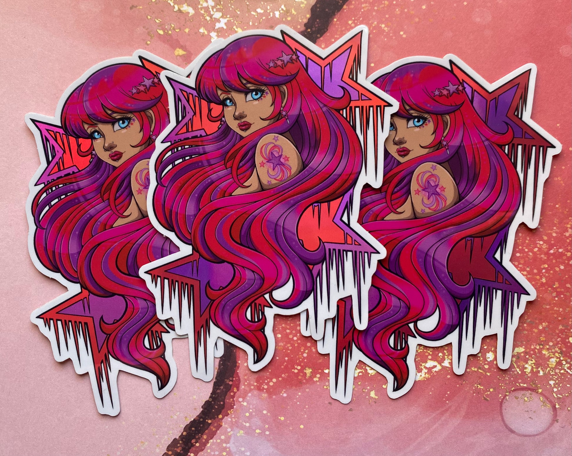Sticker measures 4”, with holographic details. Sticker is UV resistant, and weatherproof.