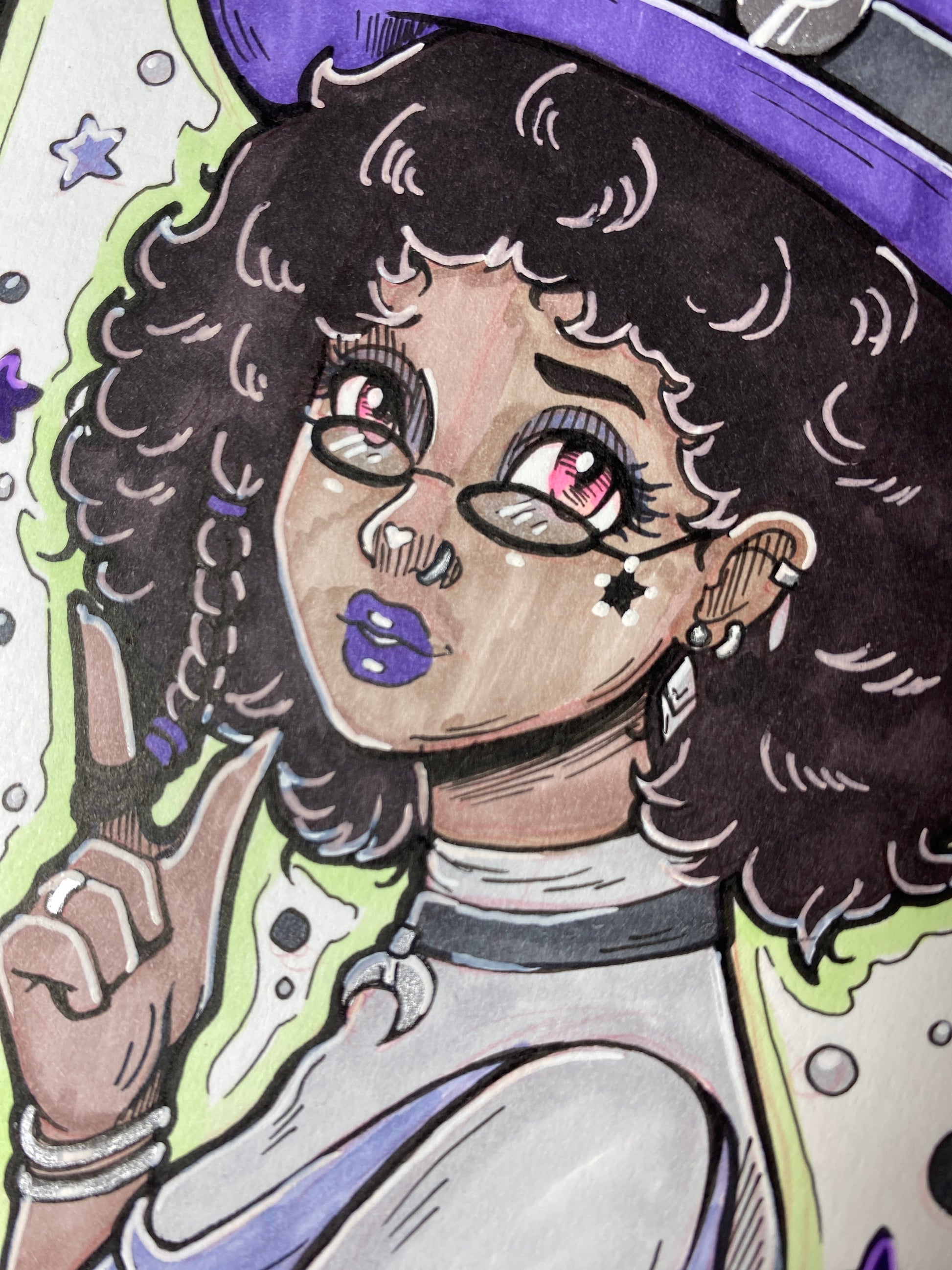 Art measures 4”x6”, drawn on card stock with ink pen, alcohol marker and white gel pen.