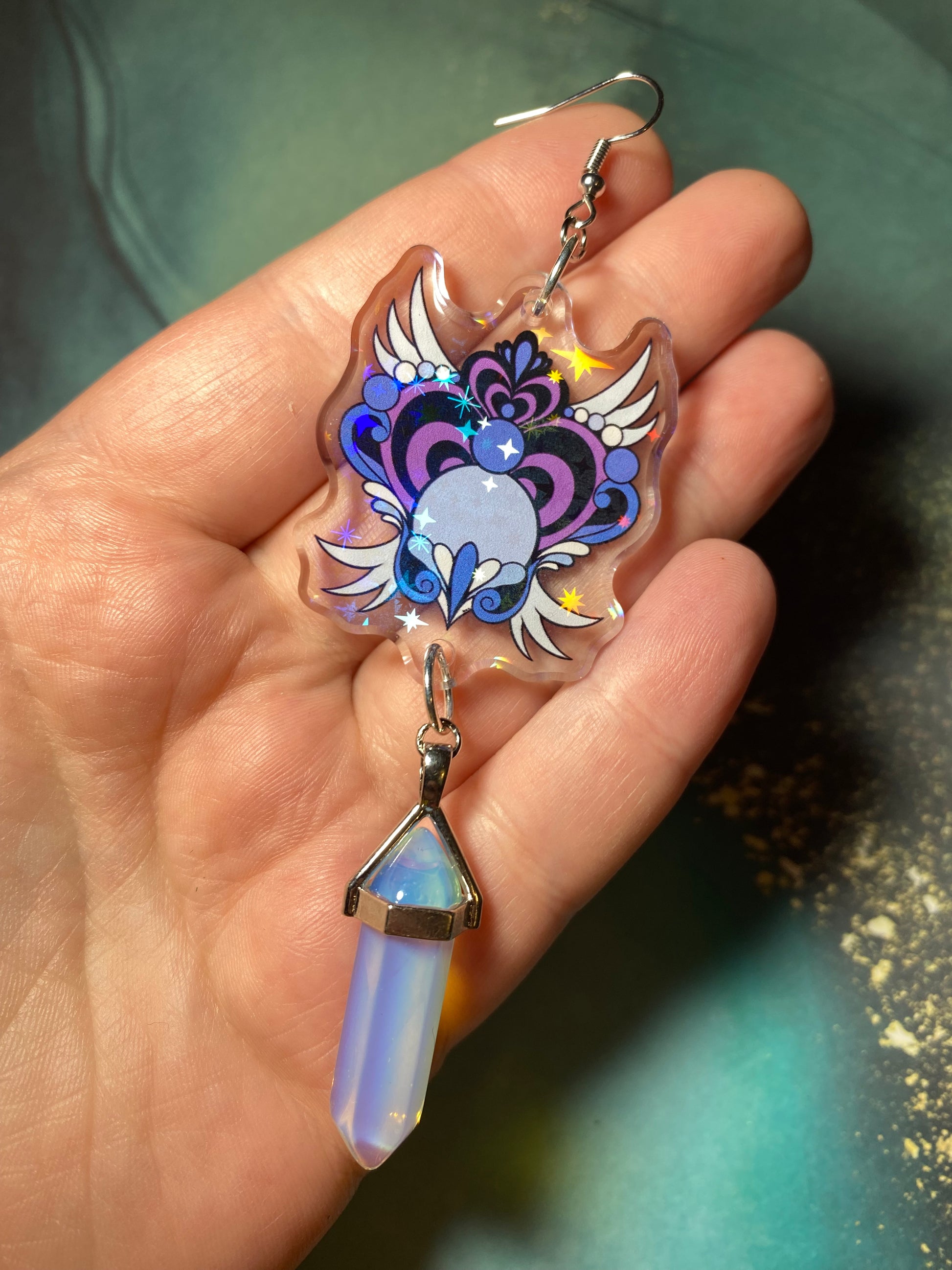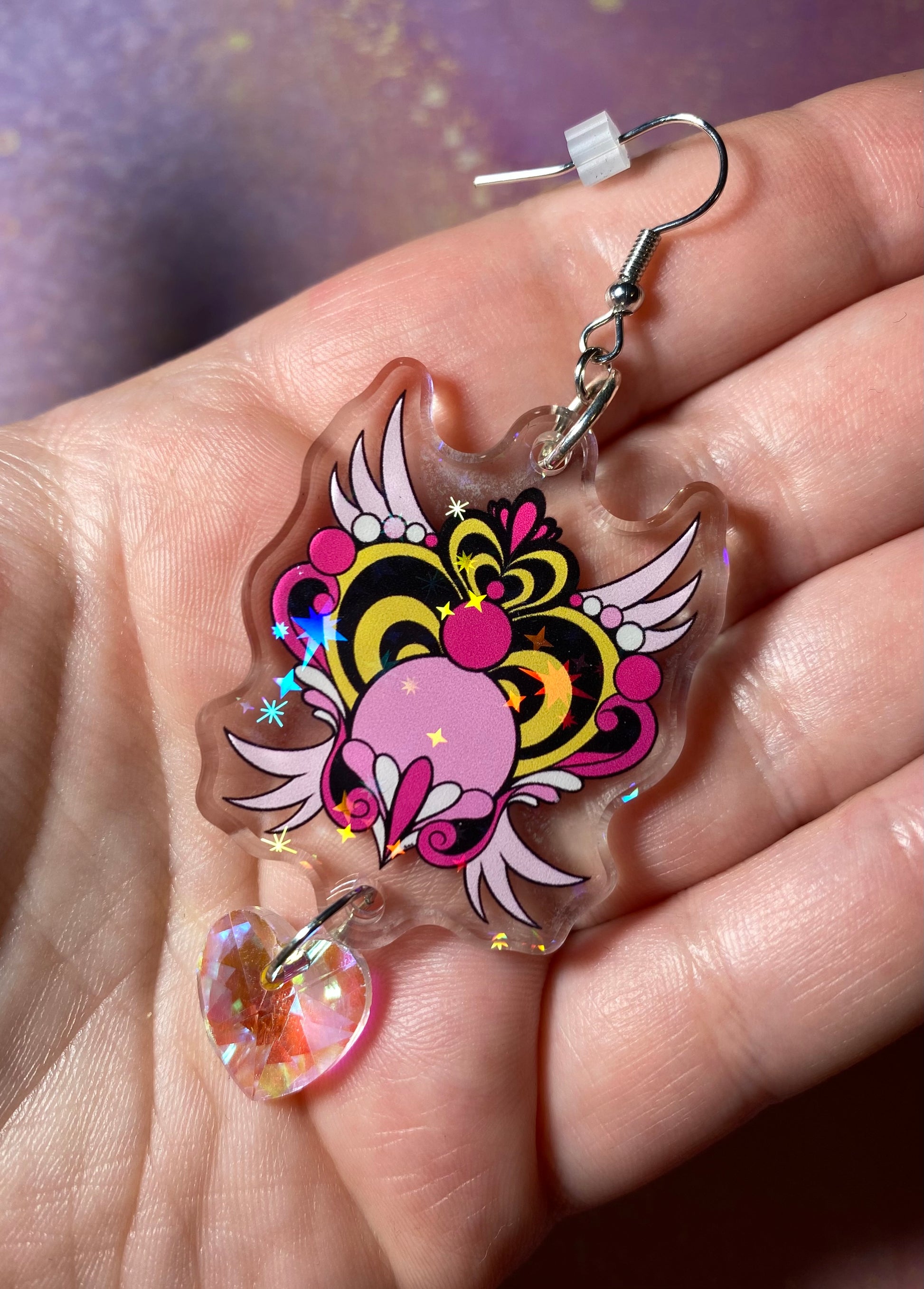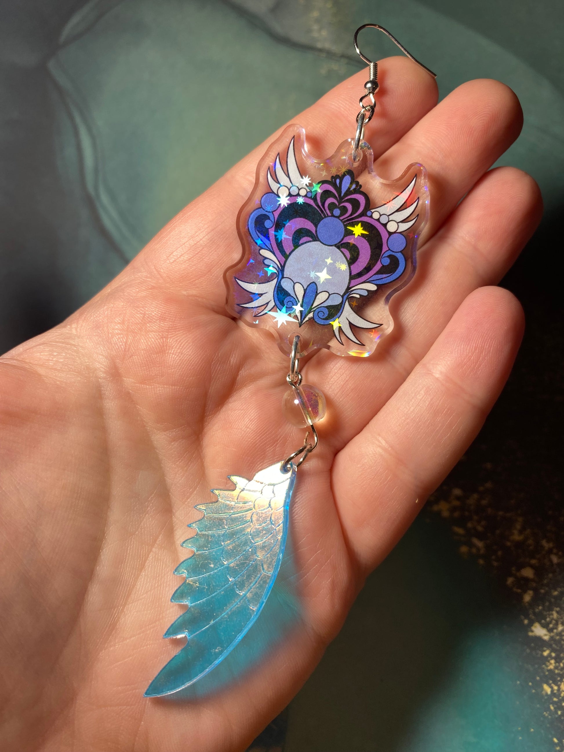 Earrings have nickel free french hooks with a squishy plastic backing. Charms are made from acrylic/epoxy with a holographic starry finish on the front of the charm.